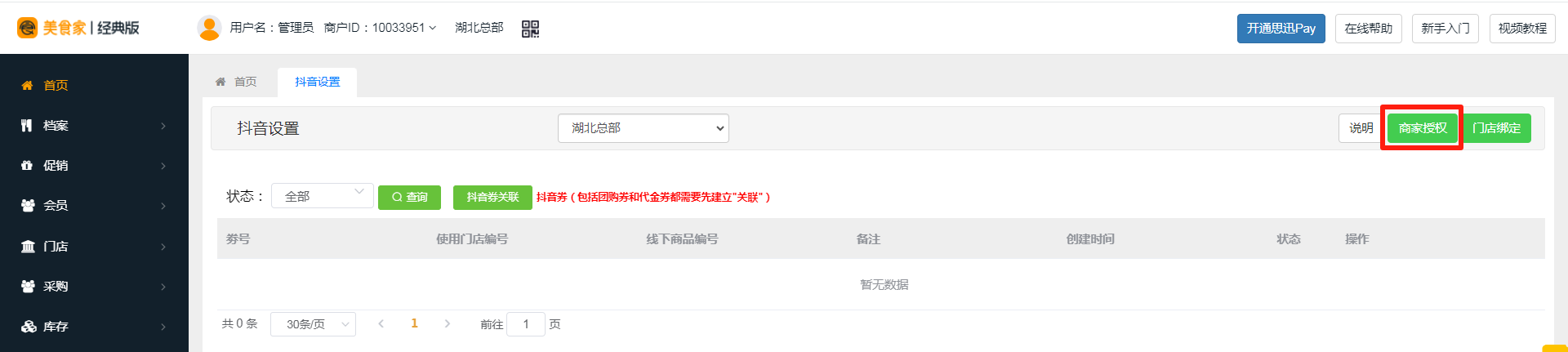 (1)登录美食家经典版后台,点击右上角商家授权,会跳转至抖音来客登录界面;