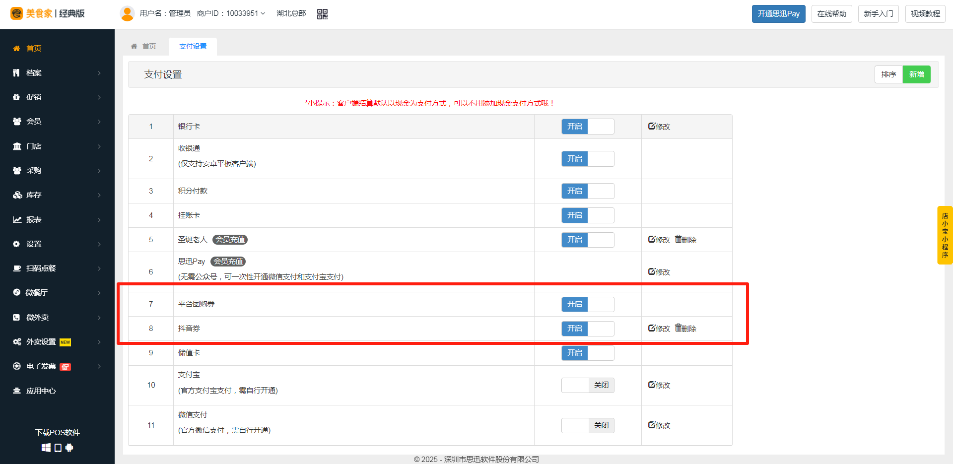 美食家经典版后台-系统设置-支付设置,开启平台团购券和抖音劵,前台下载数据。