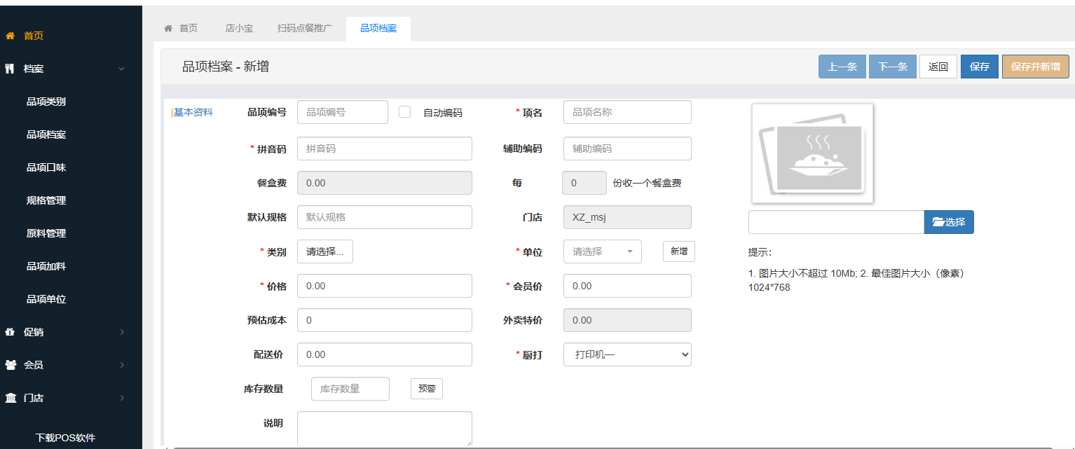 目录 搜索 美食家经典版学习指南美食家经典版后台管理一、系统功能概述二、使用须知三、登录系统四、开店向导五、后台首页六、档案七、促销7.1 促销计划7.1.1 促销计划-特价7.1.2 促销计划-折扣7.1.3 促销计划-买一赠一7.1.4 促销计划-第二份半价7.1.5 促销计划-满减7.1.6 促销计划-满量7.1.7 促销计划-满赠7.2 套餐热卖7.3 当前促销7.4 促销汇总八、会员8.1 会员资料8.2 会员类别8.3 会员设置8.4 会员消费8.5 会员积分8.6 会员储值8.7 充值赠送8.8 小额储值8.9 优惠券8.10 会员挂账结算8.11 精准营销8.12 消费满额送券九、门店9.1 门店管理9.2 店员管理9.3 桌位管理9.4 pos授权十、采购10.1 入库单10.2 采购申请单十一、库存十二、报表12.1 收银情况查询12.2 品项销售查询12.3 储值分析12.4 会员消费十三、设置13.1 支付设置13.2 商户资料13.3 数据清理13.4 个人账号13.5 外卖设置13.6 销售设置13.7 短信设置十四、扫码点餐14.1 扫码点菜设置14.2 商户设置14.3 扫码点餐装修14.4 店铺装修模版十五、微餐厅15.1 门店小程序码15.2 抽奖设置十六、微外卖16.1 微外卖设置16.2 配送设置十七、下载美食家经典版Windows前台使用须知登录点菜销售清单菜品信息菜品编辑收款结账桌台桌台操作桌台状态菜品编辑菜品操作收款结账订单扫码点餐饿了么餐道微外卖查交易查订单订单详情交班交班估清沽清会员新增会员查询|读卡挂失换卡修改资料修改密码积分调整储值充值查看优惠券报表营业汇总收银汇总菜品销售流水菜品销售汇总设置双屏钱箱计价秤小票打印基础设置票头票尾打印明细读卡器APP下载快捷键条码秤标签打印厨房打印客显其他更多桌台预订日志酒水寄存云小店一、产品介绍二、美食家经典版后台环境配置2.1 账号注册与续费2.1.1 注册2.1.2 续费及购买2.2 云小店后台配置2.2.1 新增云小店2.2.2 店员设置2.2.3 品项设置2.2.4 支付设置2.2.5 扫码点餐设置三、云小店小程序使用3.1 云小店登录3.2 云小店界面3.2.1 云小店设置3.2.2 品项管理3.2.3 订单管理3.2.4 数据分析3.2.5 小票打印3.2.6 今日订单3.3 下单支付4 消息推送4.1 顾客消息推送5 异常处理5.1 异常单据5.2 店员常见问题异常故障排查美食家经典版常见问题前言一、社区登记问题指南二、安装及登录类问题1、软件实施系统环境检查2、Windows XP 系统上安装运行问题3、Windows 10 系统上安装运行问题4、程序异常类问题5、程序已停止工作类问题6、初始化类问题6.1、数据库初始化失败6.2、服务异常,数据库服务启动异常6.3、链接数据库失败6.4、打开运行后,初始化时在“正在创建数据库用户”卡住不动7、设置主副收银8、登录类问题三、Windows 客户端常见问题1、交班2、小票打印3、思迅 pay3.1 思迅 pay 付款语音播报3.2 门店单独设置思迅 pay4、反结账5、下传数据报错6、前台优惠券的核销7、饿了么配送没有权限四、后台常见类问题1、开通会员储值2、开通会员挂账3、套餐设置4、附加费(茶位费)设置5、时价菜设置6、临时品项设置7、称重商品单位转换8、支付设置9、库存设置9.1 设置品项库存9.2 设置原料库存五、扫码点餐类问题1、获取桌台状态失败2、扫码点餐不能在线支付3、获取线下开单号失败4、餐前支付保留桌台占用状态六、店小宝常见问题1、店小宝多人使用七、安卓 POS 端常见问题1、安卓 POS 端连接 USB 打印机的操作步骤八、运营平台常见问题1、买断账号修改有效期美食家经典版聚合外卖团购劵1、开通和购买流量2、外卖平台授权绑定3、菜品绑定4、前台订单管理5、团购券套餐管理6、京东外卖7、前台核销美团券美食家经典版抖音团购券 暂无相关搜索结果! 本文档使用 MinDoc 发布 2.2.3 品项设置 品项设置在品项档案中,新增云小店菜品类别、菜品档案等基础数据。文档更新时间: 2025-09-18 06:53 作者:徐珍