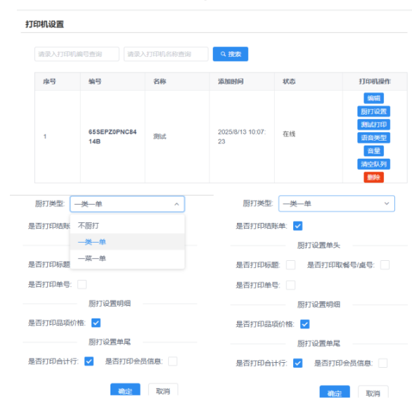 输入打印机的SN号、打印机名称。在云小店小程序绑定了打印机后,打印机数据也会同步到这里。添加打印机后,可编辑、厨打设置、测试打印机、语音类型、音量、清空队列、删除。