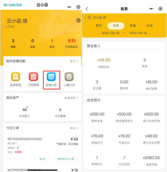 目录 搜索 美食家经典版学习指南美食家经典版后台管理一、系统功能概述二、使用须知三、登录系统四、开店向导五、后台首页六、档案七、促销7.1 促销计划7.1.1 促销计划-特价7.1.2 促销计划-折扣7.1.3 促销计划-买一赠一7.1.4 促销计划-第二份半价7.1.5 促销计划-满减7.1.6 促销计划-满量7.1.7 促销计划-满赠7.2 套餐热卖7.3 当前促销7.4 促销汇总八、会员8.1 会员资料8.2 会员类别8.3 会员设置8.4 会员消费8.5 会员积分8.6 会员储值8.7 充值赠送8.8 小额储值8.9 优惠券8.10 会员挂账结算8.11 精准营销8.12 消费满额送券九、门店9.1 门店管理9.2 店员管理9.3 桌位管理9.4 pos授权十、采购10.1 入库单10.2 采购申请单十一、库存十二、报表12.1 收银情况查询12.2 品项销售查询12.3 储值分析12.4 会员消费十三、设置13.1 支付设置13.2 商户资料13.3 数据清理13.4 个人账号13.5 外卖设置13.6 销售设置13.7 短信设置十四、扫码点餐14.1 扫码点菜设置14.2 商户设置14.3 扫码点餐装修14.4 店铺装修模版十五、微餐厅15.1 门店小程序码15.2 抽奖设置十六、微外卖16.1 微外卖设置16.2 配送设置十七、下载美食家经典版Windows前台使用须知登录点菜销售清单菜品信息菜品编辑收款结账桌台桌台操作桌台状态菜品编辑菜品操作收款结账订单扫码点餐饿了么餐道微外卖查交易查订单订单详情交班交班估清沽清会员新增会员查询|读卡挂失换卡修改资料修改密码积分调整储值充值查看优惠券报表营业汇总收银汇总菜品销售流水菜品销售汇总设置双屏钱箱计价秤小票打印基础设置票头票尾打印明细读卡器APP下载快捷键条码秤标签打印厨房打印客显其他更多桌台预订日志酒水寄存云小店一、产品介绍二、美食家经典版后台环境配置2.1 账号注册与续费2.1.1 注册2.1.2 续费及购买2.2 云小店后台配置2.2.1 新增云小店2.2.2 店员设置2.2.3 品项设置2.2.4 支付设置2.2.5 扫码点餐设置三、云小店小程序使用3.1 云小店登录3.2 云小店界面3.2.1 云小店设置3.2.2 品项管理3.2.3 订单管理3.2.4 数据分析3.2.5 小票打印3.2.6 今日订单3.3 下单支付4 消息推送4.1 顾客消息推送5 异常处理5.1 异常单据5.2 店员常见问题异常故障排查美食家经典版常见问题前言一、社区登记问题指南二、安装及登录类问题1、软件实施系统环境检查2、Windows XP 系统上安装运行问题3、Windows 10 系统上安装运行问题4、程序异常类问题5、程序已停止工作类问题6、初始化类问题6.1、数据库初始化失败6.2、服务异常,数据库服务启动异常6.3、链接数据库失败6.4、打开运行后,初始化时在“正在创建数据库用户”卡住不动7、设置主副收银8、登录类问题三、Windows 客户端常见问题1、交班2、小票打印3、思迅 pay3.1 思迅 pay 付款语音播报3.2 门店单独设置思迅 pay4、反结账5、下传数据报错6、前台优惠券的核销7、饿了么配送没有权限四、后台常见类问题1、开通会员储值2、开通会员挂账3、套餐设置4、附加费(茶位费)设置5、时价菜设置6、临时品项设置7、称重商品单位转换8、支付设置9、库存设置9.1 设置品项库存9.2 设置原料库存五、扫码点餐类问题1、获取桌台状态失败2、扫码点餐不能在线支付3、获取线下开单号失败4、餐前支付保留桌台占用状态六、店小宝常见问题1、店小宝多人使用七、安卓 POS 端常见问题1、安卓 POS 端连接 USB 打印机的操作步骤八、运营平台常见问题1、买断账号修改有效期美食家经典版聚合外卖团购劵1、开通和购买流量2、外卖平台授权绑定3、菜品绑定4、前台订单管理5、团购券套餐管理6、京东外卖7、前台核销美团券美食家经典版抖音团购券 暂无相关搜索结果! 本文档使用 MinDoc 发布 3.2.4 数据分析 数据分析显示当前门店的营业数据等。文档更新时间: 2025-09-18 06:40 作者:徐珍