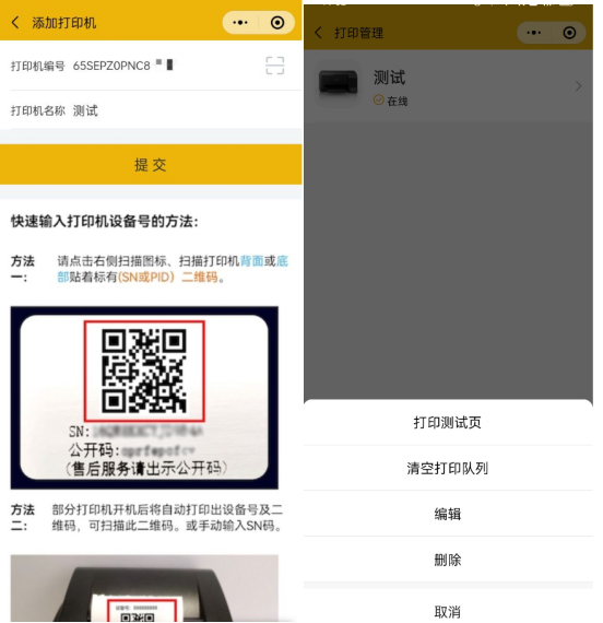 小票打印扫码打印机后的二维码或手动输入SN号、输入打印机名称即可添加打印机。打印机添加后可进行打印机测试、删除等。在云小店添加打印机后,打印机会同步到美食家经典版后台扫码点餐设置打印机的地方。文档更新时间: 2025-09-18 06:54 作者:徐珍