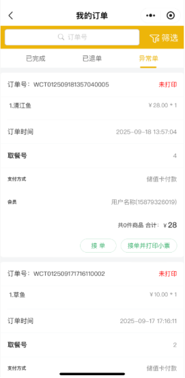 目录 搜索 美食家经典版学习指南美食家经典版后台管理一、系统功能概述二、使用须知三、登录系统四、开店向导五、后台首页六、档案七、促销7.1 促销计划7.1.1 促销计划-特价7.1.2 促销计划-折扣7.1.3 促销计划-买一赠一7.1.4 促销计划-第二份半价7.1.5 促销计划-满减7.1.6 促销计划-满量7.1.7 促销计划-满赠7.2 套餐热卖7.3 当前促销7.4 促销汇总八、会员8.1 会员资料8.2 会员类别8.3 会员设置8.4 会员消费8.5 会员积分8.6 会员储值8.7 充值赠送8.8 小额储值8.9 优惠券8.10 会员挂账结算8.11 精准营销8.12 消费满额送券九、门店9.1 门店管理9.2 店员管理9.3 桌位管理9.4 pos授权十、采购10.1 入库单10.2 采购申请单十一、库存十二、报表12.1 收银情况查询12.2 品项销售查询12.3 储值分析12.4 会员消费十三、设置13.1 支付设置13.2 商户资料13.3 数据清理13.4 个人账号13.5 外卖设置13.6 销售设置13.7 短信设置十四、扫码点餐14.1 扫码点菜设置14.2 商户设置14.3 扫码点餐装修14.4 店铺装修模版十五、微餐厅15.1 门店小程序码15.2 抽奖设置十六、微外卖16.1 微外卖设置16.2 配送设置十七、下载美食家经典版Windows前台使用须知登录点菜销售清单菜品信息菜品编辑收款结账桌台桌台操作桌台状态菜品编辑菜品操作收款结账订单扫码点餐饿了么餐道微外卖查交易查订单订单详情交班交班估清沽清会员新增会员查询|读卡挂失换卡修改资料修改密码积分调整储值充值查看优惠券报表营业汇总收银汇总菜品销售流水菜品销售汇总设置双屏钱箱计价秤小票打印基础设置票头票尾打印明细读卡器APP下载快捷键条码秤标签打印厨房打印客显其他更多桌台预订日志酒水寄存云小店一、产品介绍二、美食家经典版后台环境配置2.1 账号注册与续费2.1.1 注册2.1.2 续费及购买2.2 云小店后台配置2.2.1 新增云小店2.2.2 店员设置2.2.3 品项设置2.2.4 支付设置2.2.5 扫码点餐设置三、云小店小程序使用3.1 云小店登录3.2 云小店界面3.2.1 云小店设置3.2.2 品项管理3.2.3 订单管理3.2.4 数据分析3.2.5 小票打印3.2.6 今日订单3.3 下单支付4 消息推送4.1 顾客消息推送5 异常处理5.1 异常单据5.2 店员常见问题异常故障排查美食家经典版常见问题前言一、社区登记问题指南二、安装及登录类问题1、软件实施系统环境检查2、Windows XP 系统上安装运行问题3、Windows 10 系统上安装运行问题4、程序异常类问题5、程序已停止工作类问题6、初始化类问题6.1、数据库初始化失败6.2、服务异常,数据库服务启动异常6.3、链接数据库失败6.4、打开运行后,初始化时在“正在创建数据库用户”卡住不动7、设置主副收银8、登录类问题三、Windows 客户端常见问题1、交班2、小票打印3、思迅 pay3.1 思迅 pay 付款语音播报3.2 门店单独设置思迅 pay4、反结账5、下传数据报错6、前台优惠券的核销7、饿了么配送没有权限四、后台常见类问题1、开通会员储值2、开通会员挂账3、套餐设置4、附加费(茶位费)设置5、时价菜设置6、临时品项设置7、称重商品单位转换8、支付设置9、库存设置9.1 设置品项库存9.2 设置原料库存五、扫码点餐类问题1、获取桌台状态失败2、扫码点餐不能在线支付3、获取线下开单号失败4、餐前支付保留桌台占用状态六、店小宝常见问题1、店小宝多人使用七、安卓 POS 端常见问题1、安卓 POS 端连接 USB 打印机的操作步骤八、运营平台常见问题1、买断账号修改有效期美食家经典版聚合外卖团购劵1、开通和购买流量2、外卖平台授权绑定3、菜品绑定4、前台订单管理5、团购券套餐管理6、京东外卖7、前台核销美团券美食家经典版抖音团购券 暂无相关搜索结果! 本文档使用 MinDoc 发布 5.1 异常单据 异常单据客户扫码结算界面,不显示订单完成,且云小店显示异常时,可手动接单。文档更新时间: 2025-09-18 07:15 作者:徐珍