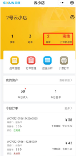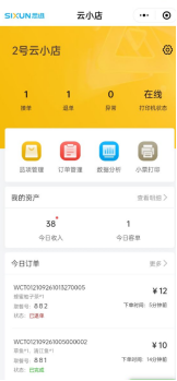 云小店界面云小店主界面统计了当日订单数量:接单数量、退单数量和异常订单数量,图16.图16 云小店主界面 当打印机缺纸或离线时,打印机状态会变成“缺纸”“离线”,同时扫码下单的订单会统计在“异常”里,图17。图17 打印纸状态异常文档更新时间: 2025-09-17 07:24 作者:徐珍