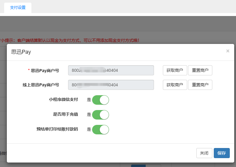 目录 搜索 美食家经典版学习指南美食家经典版后台管理一、系统功能概述二、使用须知三、登录系统四、开店向导五、后台首页六、档案七、促销7.1 促销计划7.1.1 促销计划-特价7.1.2 促销计划-折扣7.1.3 促销计划-买一赠一7.1.4 促销计划-第二份半价7.1.5 促销计划-满减7.1.6 促销计划-满量7.1.7 促销计划-满赠7.2 套餐热卖7.3 当前促销7.4 促销汇总八、会员8.1 会员资料8.2 会员类别8.3 会员设置8.4 会员消费8.5 会员积分8.6 会员储值8.7 充值赠送8.8 小额储值8.9 优惠券8.10 会员挂账结算8.11 精准营销8.12 消费满额送券九、门店9.1 门店管理9.2 店员管理9.3 桌位管理9.4 pos授权十、采购10.1 入库单10.2 采购申请单十一、库存十二、报表12.1 收银情况查询12.2 品项销售查询12.3 储值分析12.4 会员消费十三、设置13.1 支付设置13.2 商户资料13.3 数据清理13.4 个人账号13.5 外卖设置13.6 销售设置13.7 短信设置十四、扫码点餐14.1 扫码点菜设置14.2 商户设置14.3 扫码点餐装修14.4 店铺装修模版十五、微餐厅15.1 门店小程序码15.2 抽奖设置十六、微外卖16.1 微外卖设置16.2 配送设置十七、下载美食家经典版Windows前台使用须知登录点菜销售清单菜品信息菜品编辑收款结账桌台桌台操作桌台状态菜品编辑菜品操作收款结账订单扫码点餐饿了么餐道微外卖查交易查订单订单详情交班交班估清沽清会员新增会员查询|读卡挂失换卡修改资料修改密码积分调整储值充值查看优惠券报表营业汇总收银汇总菜品销售流水菜品销售汇总设置双屏钱箱计价秤小票打印基础设置票头票尾打印明细读卡器APP下载快捷键条码秤标签打印厨房打印客显其他更多桌台预订日志酒水寄存云小店一、产品介绍二、美食家经典版后台环境配置2.1 账号注册与续费2.1.1 注册2.1.2 续费及购买2.2 云小店后台配置2.2.1 新增云小店2.2.2 店员设置2.2.3 品项设置2.2.4 支付设置2.2.5 扫码点餐设置三、云小店小程序使用3.1 云小店登录3.2 云小店界面3.2.1 云小店设置3.2.2 品项管理3.2.3 订单管理3.2.4 数据分析3.2.5 小票打印3.2.6 今日订单3.3 下单支付4 消息推送4.1 顾客消息推送5 异常处理5.1 异常单据5.2 店员常见问题异常故障排查美食家经典版常见问题前言一、社区登记问题指南二、安装及登录类问题1、软件实施系统环境检查2、Windows XP 系统上安装运行问题3、Windows 10 系统上安装运行问题4、程序异常类问题5、程序已停止工作类问题6、初始化类问题6.1、数据库初始化失败6.2、服务异常,数据库服务启动异常6.3、链接数据库失败6.4、打开运行后,初始化时在“正在创建数据库用户”卡住不动7、设置主副收银8、登录类问题三、Windows 客户端常见问题1、交班2、小票打印3、思迅 pay3.1 思迅 pay 付款语音播报3.2 门店单独设置思迅 pay4、反结账5、下传数据报错6、前台优惠券的核销7、饿了么配送没有权限四、后台常见类问题1、开通会员储值2、开通会员挂账3、套餐设置4、附加费(茶位费)设置5、时价菜设置6、临时品项设置7、称重商品单位转换8、支付设置9、库存设置9.1 设置品项库存9.2 设置原料库存五、扫码点餐类问题1、获取桌台状态失败2、扫码点餐不能在线支付3、获取线下开单号失败4、餐前支付保留桌台占用状态六、店小宝常见问题1、店小宝多人使用七、安卓 POS 端常见问题1、安卓 POS 端连接 USB 打印机的操作步骤八、运营平台常见问题1、买断账号修改有效期美食家经典版聚合外卖团购劵1、开通和购买流量2、外卖平台授权绑定3、菜品绑定4、前台订单管理5、团购券套餐管理6、京东外卖7、前台核销美团券美食家经典版抖音团购券 暂无相关搜索结果! 本文档使用 MinDoc 发布 2.2.4 支付设置 支付设置支付设置:设置→支付设置,选择思迅Pay开启,修改,录入思迅Pay商户号,同时开启是否小程序微信支付、是否用于充值参数。文档更新时间: 2025-09-18 06:53 作者:徐珍