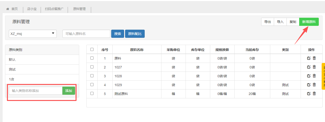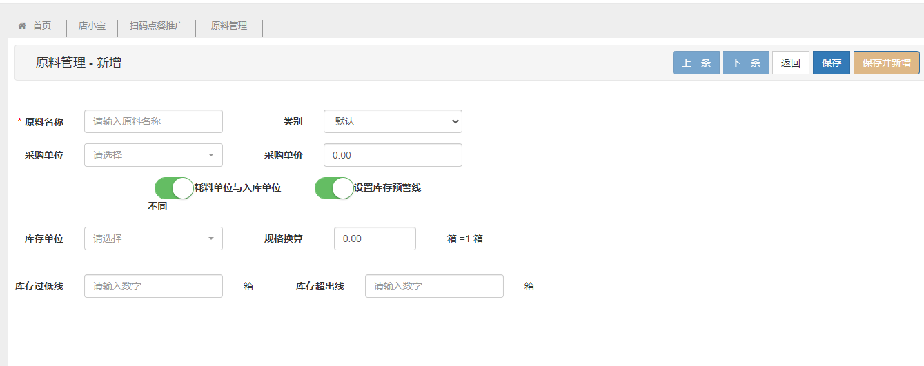 录入原料类别,点击“添加”,即原料类别添加成功,点击“新增原料”,录入原料名称、类别、采购单位、采购单价,若勾选耗料单位与入库单位不同,则需要设置库存单位,设置规格换算,勾选设置库存预警线,需设置库存过低线与库存超出线,点击保存即可。