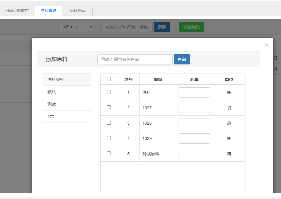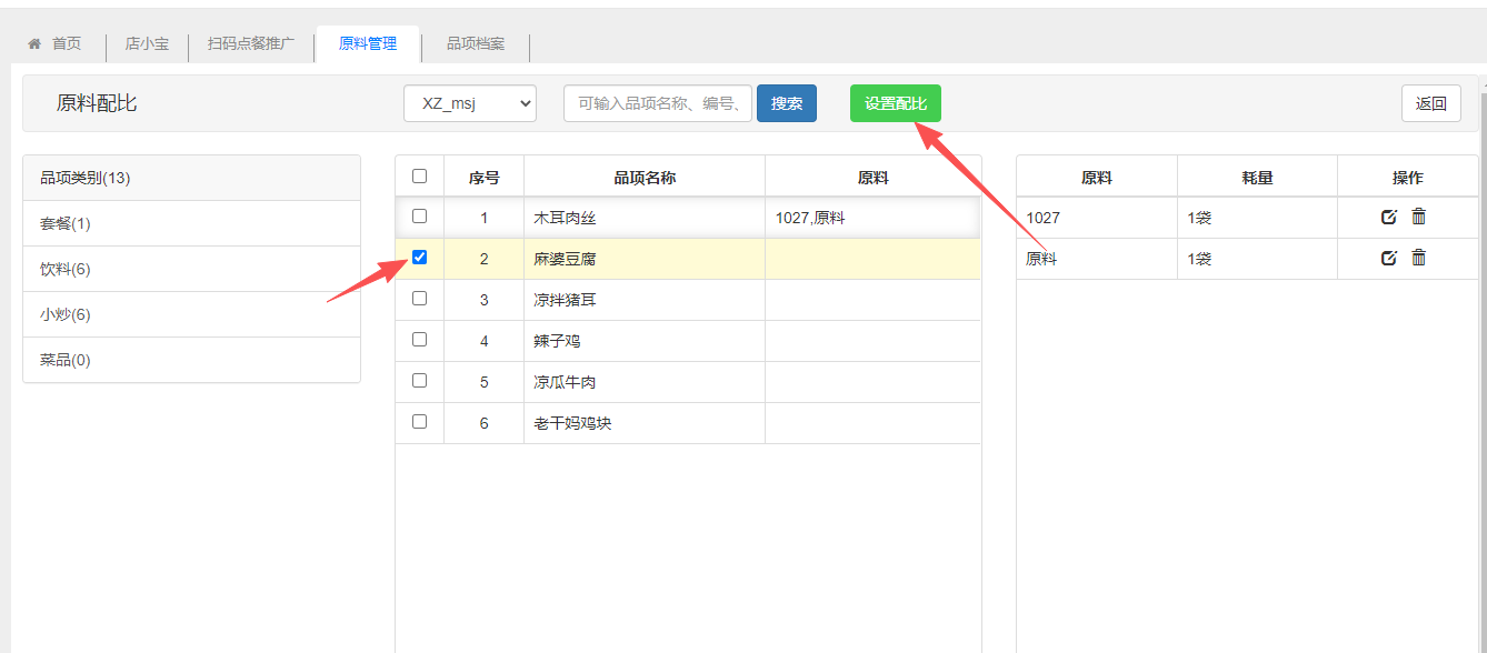 介绍:原料配比,将品项与原料搭配起来,品项资料中需开启自动冲减原料。操作:选中品项,点击“设置配比”,勾选原料,设置耗量,点击保存即可,若耗量设置为1,则前台销售一个品项即库存会扣减一个原料库存。