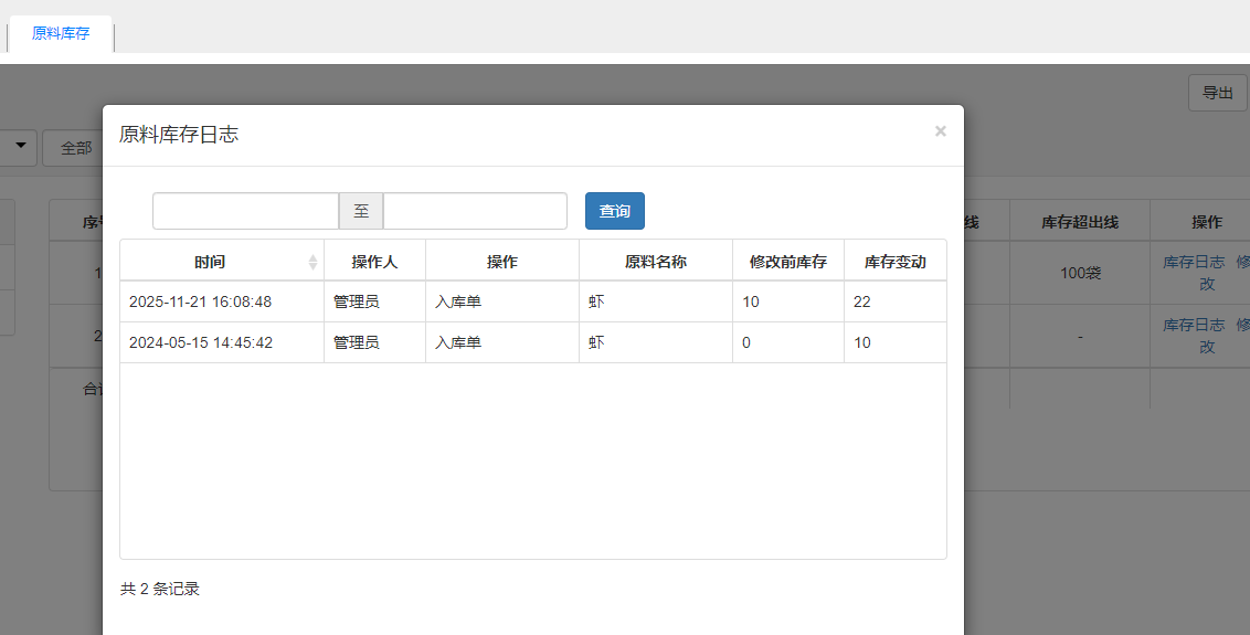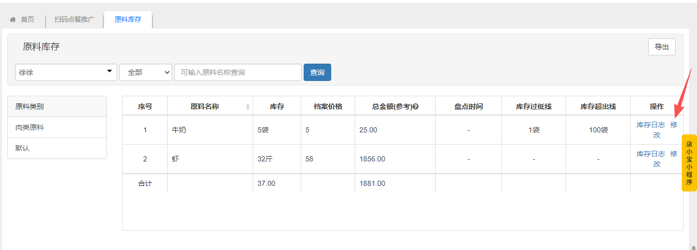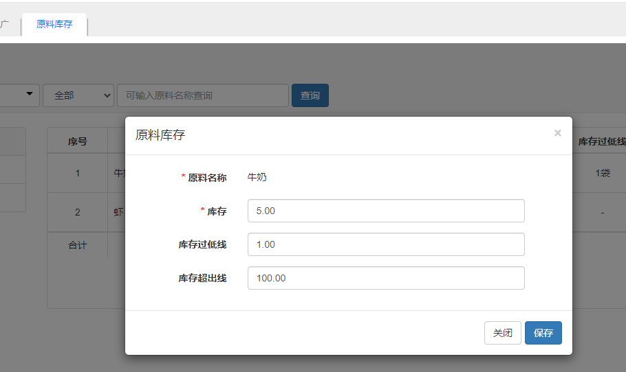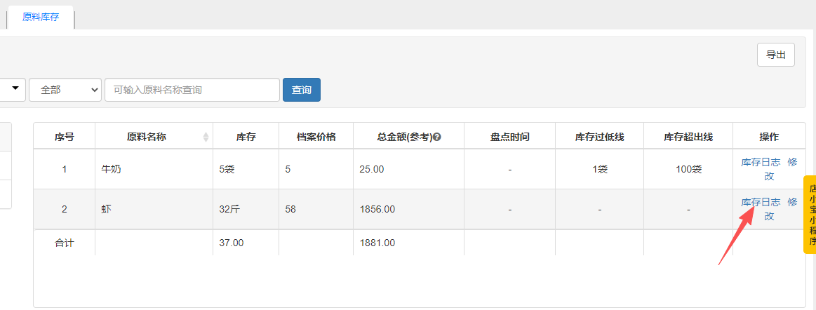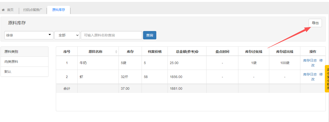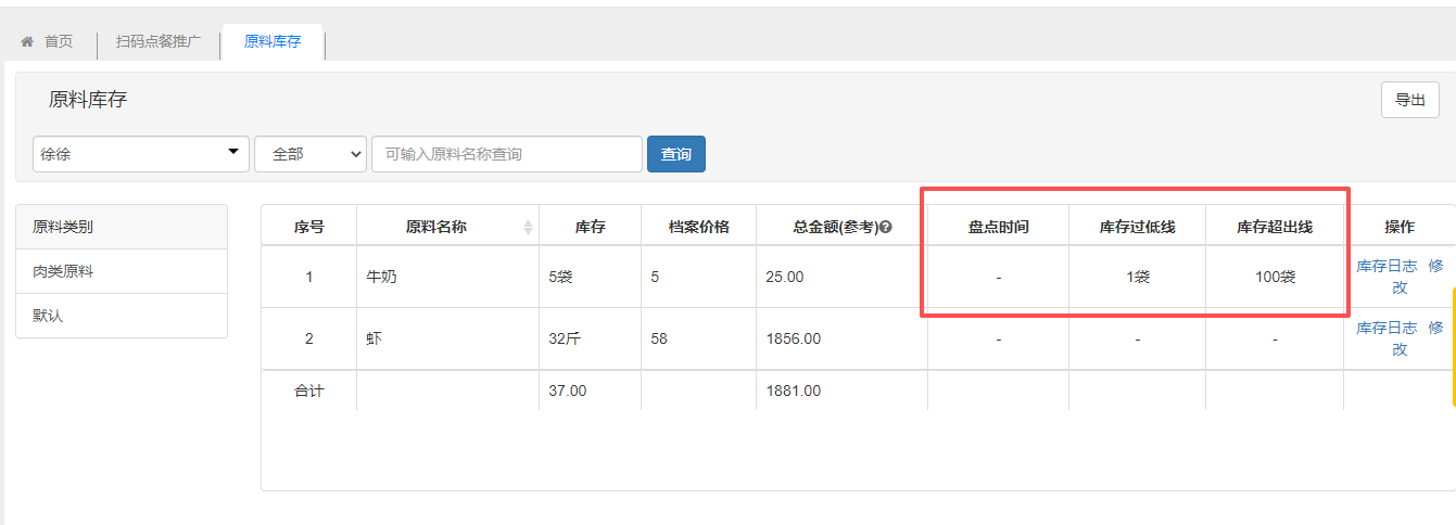 用于查询当前原料库存,同时可以修改库存,设置库存预警线,以及查看库存日志。 1、可以查看原料库存、盘点时间、库存过低线和库存超出线。2、点击修改,可以修改库存和库存过低线、库存超出线。3、点击库存日志,可以查看库存日志,包括前台销售扣减、入库单、盘点单、报损单、手动修改库存。4、可以导出原料库存信息。 文档更新时间: 2025-11-21 08:36 作者:chensm1