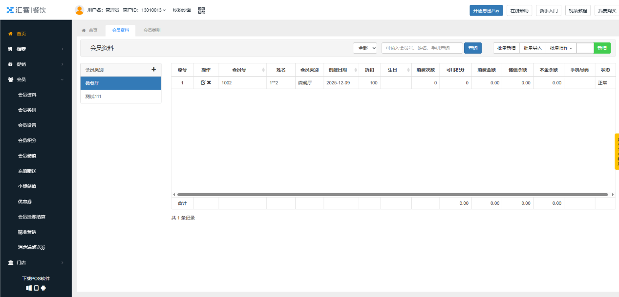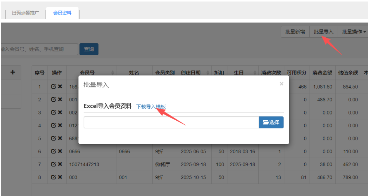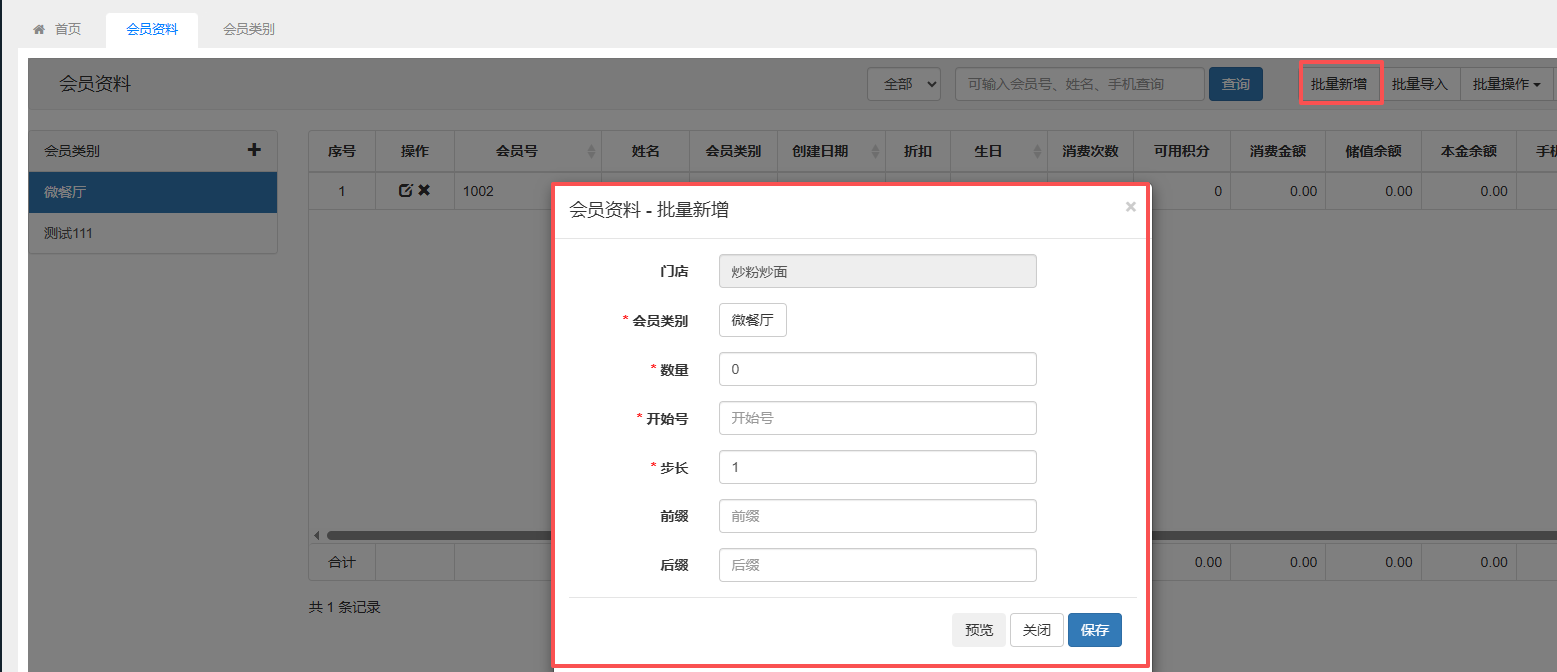 介绍:可以新增会员、查看会员信息或者是对会员信息进行修改和删除。 操作:点击“新增”,录入会员号、姓名、会员类别、手机号、生日等信息,点击保存,即会员新增成功。 如图所示 批量新增可以成批量增加会员卡号。如图所示 批量操作可以批量给会员充值、置零和清积分。如图所示 批量导入可以下载会员导入模板,按模板整理好会员信息后进行导入。如图所示 文档更新时间: 2025-12-09 01:54 作者:chenlh