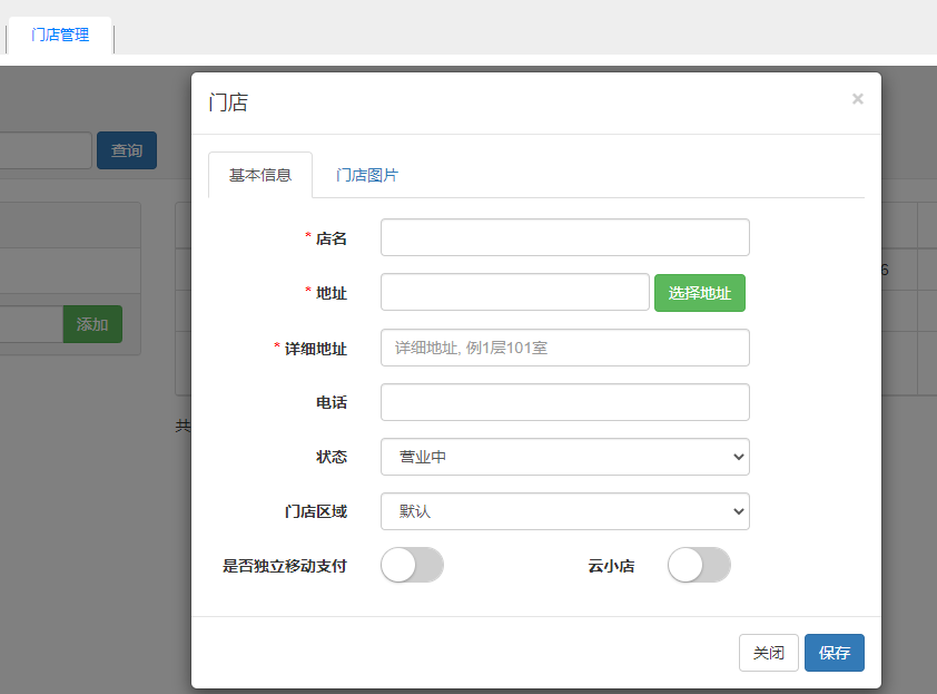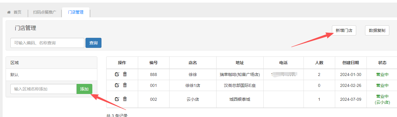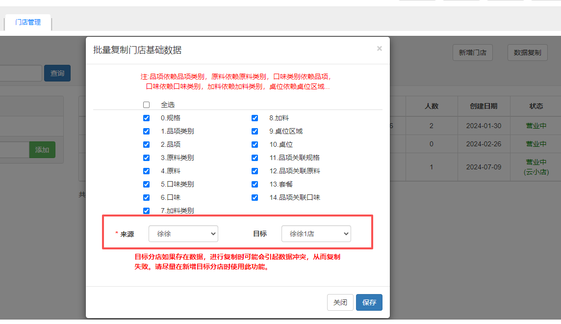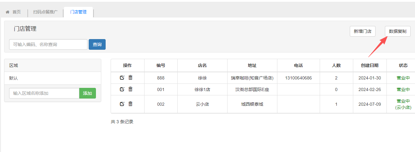 〖门店管理〗:用于建立区域及门店资料,以及数据复制。 新增门店先新增门店区域,再新增门店。门店独立支付:门店需要独立支付开启该参数即可,再登录分店后台设置思迅pay商户号;云小店:如果要使用云小店模式,开启该参数 数据复制可以把某个门店的数据批量复制到另一个门店,如品项、原料、桌位等信息。 文档更新时间: 2025-11-20 08:00 作者:chenlh