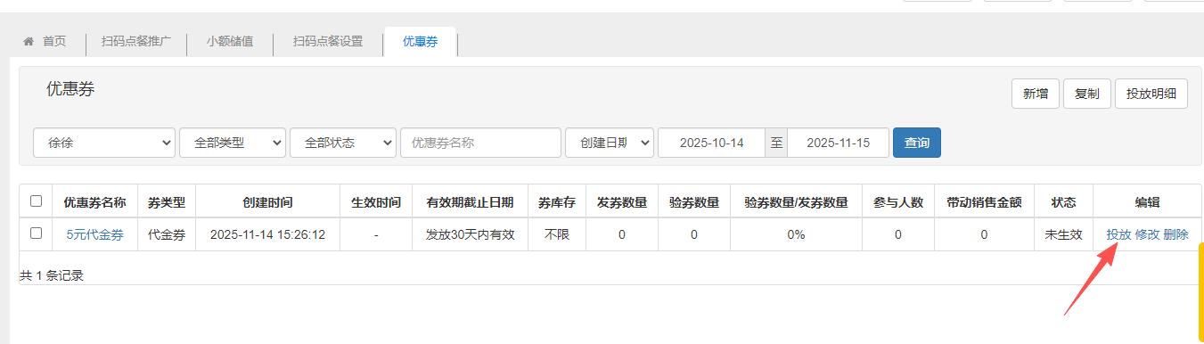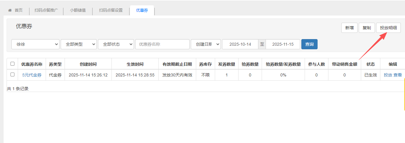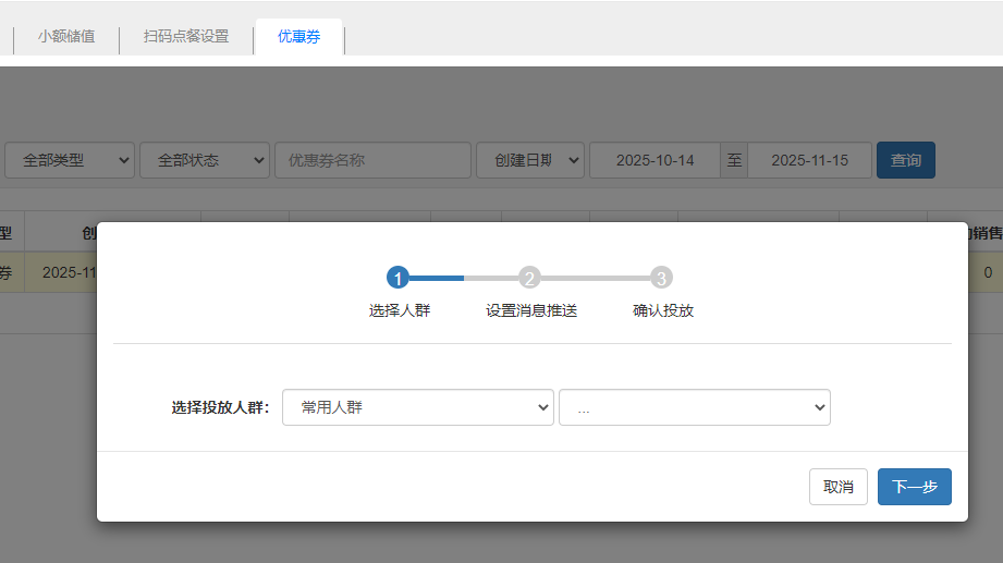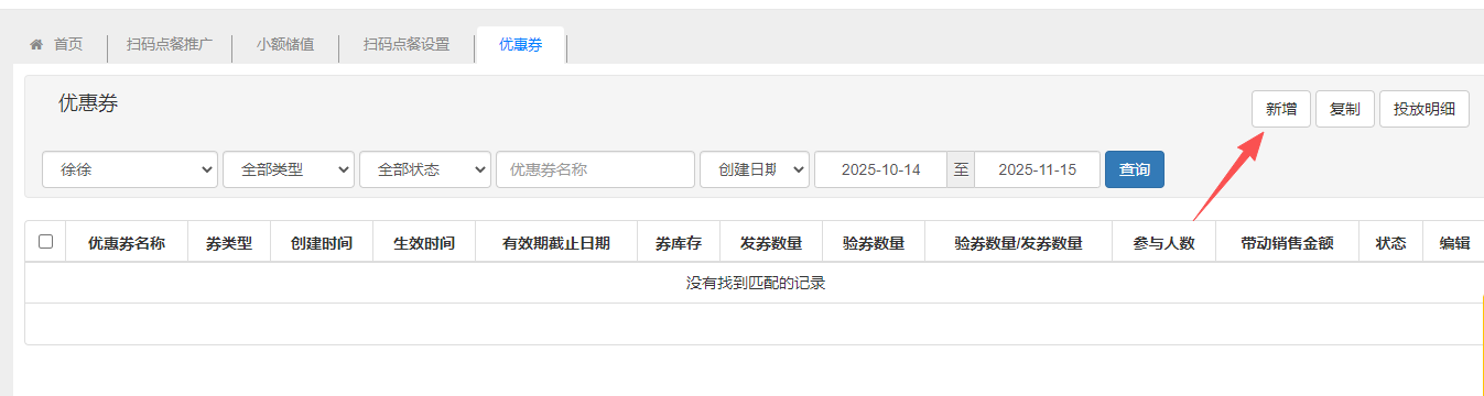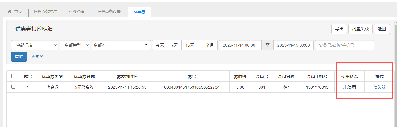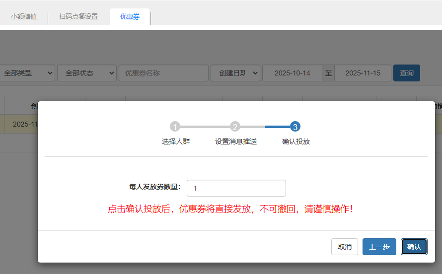 管理优惠券,优惠券分为:菜品券、代金券。设置完成后,可筛选人群投放。 新增优惠券填写券类型、优惠券名称、券面额、券有效期等信息,建立优惠券。 投放优惠券优惠券新增好之后,可以手动投放优惠券,选择会员,输入需要投放的券数量。 查看券投放明细优惠券投放后,点击投放明细,可以查看优惠券投放明细,查看优惠券的使用状态,还可以手动失效优惠券。 文档更新时间: 2025-11-14 07:32 作者:徐珍