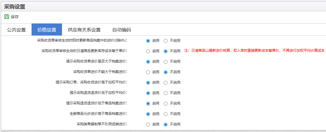 相关使用了解点击可跳转>>>提示采购订单,采购收货进价高于加权平均价: 启用 不启用