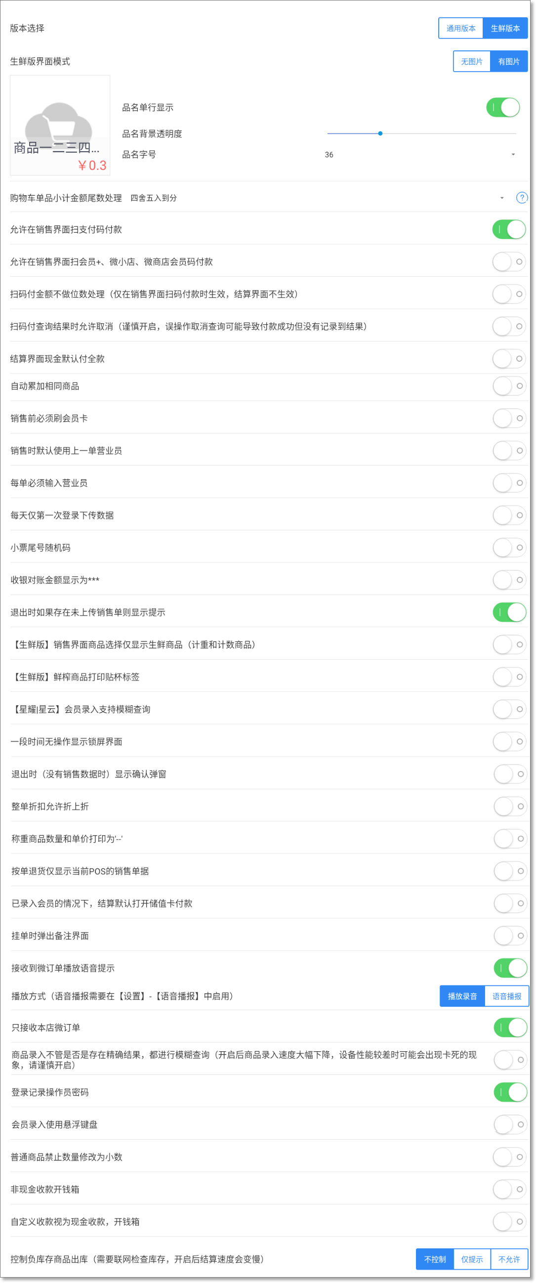 如果版本选择为生鲜版本,并且模式为有图,则支持设置:品名单行显示、品名背景透明度、品名字号。