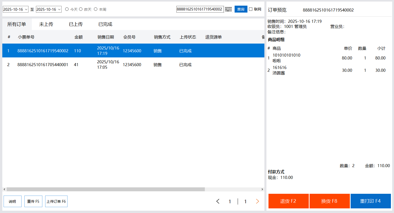 重打印F4:点击打印或按F4打印可重打印小票。如果需要携带会员信息,需要输入单号,勾选联网查询,再点击查询F1方可打印会员信息。