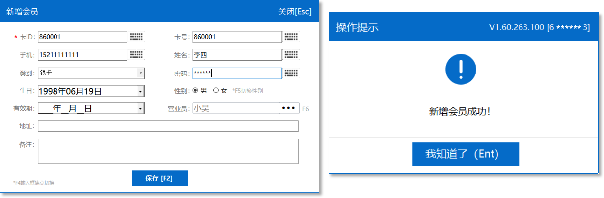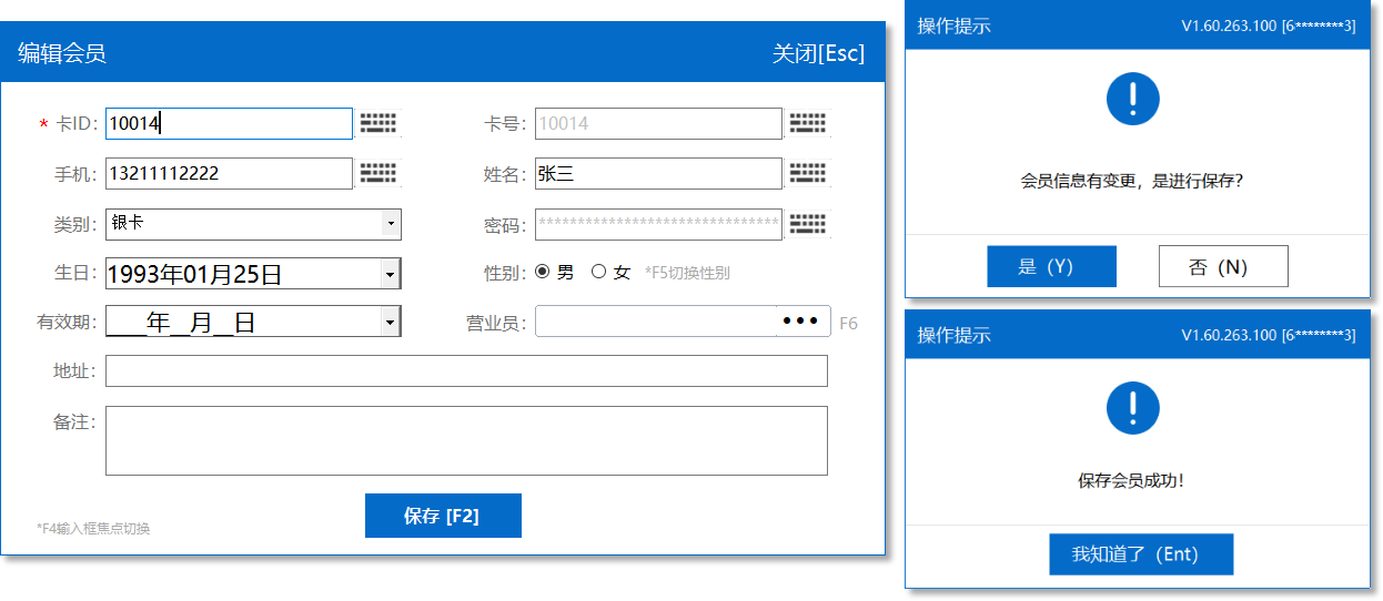 左图:查询会员后方可进行会员信息编辑操作,编辑会员弹窗光标默认定位在会员ID上。其中,性别切换键是F5,营业员弹窗键是F6,其余会员属性可通过F4切换光标焦点。