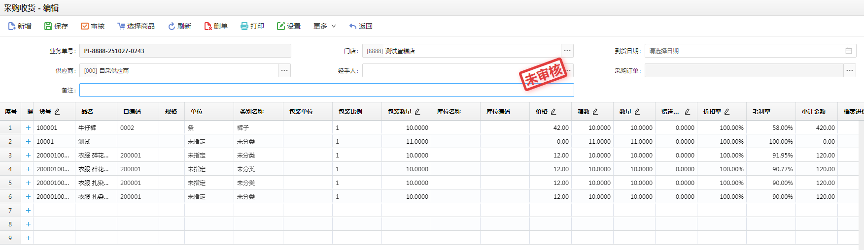 在采购收货单新增界面可以录入需要采购的商品明细