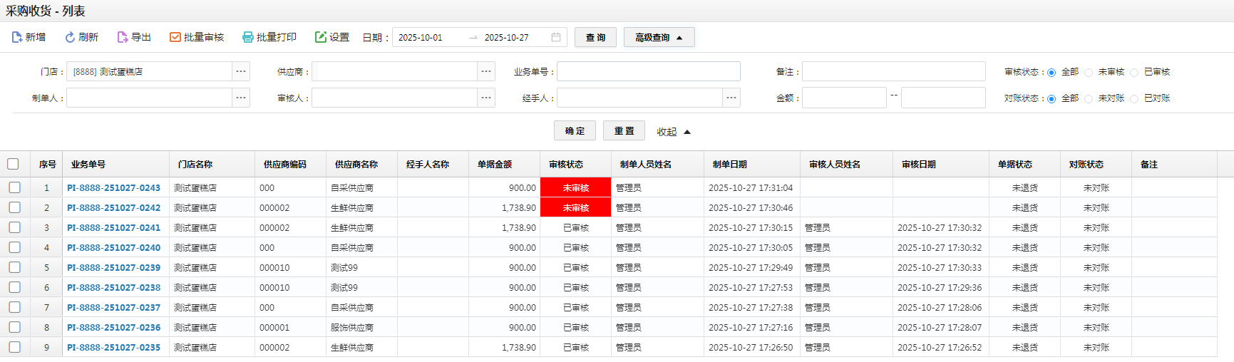 (5)批量审核:可对未审核的单据批量审核;