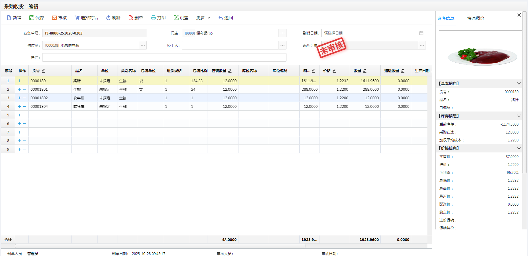 做采购收货单时,选中表格中某个商品,可点击更多-快速调价可已进行调整零售价、会员价、批发价。