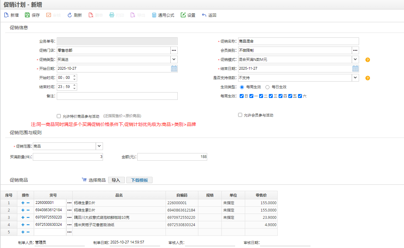 位置:【促销】-> 【买满送活动】-> 【 混合买满N数M元】
