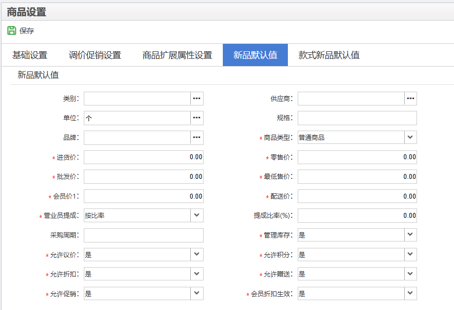 后台或管店新增单个商品档案时,是根据新品默认值的设置生成相应的商品属性,提高操作员的效率。