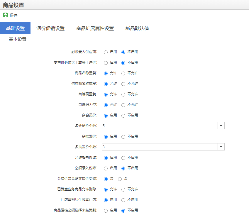 相关使用了解 点击可跳转>>>已发生业务商品允许删除:启用时,已经发生业务的商品也可以删除;反之关闭时 仅能删除没有发生业务的商品