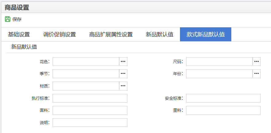 后台或管店新增单个款式档案时,是根据款式新品默认值的设置生成相应的商品属性,提高操作员的效率。