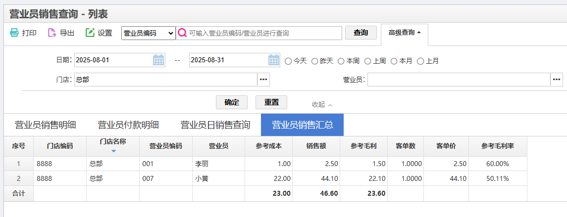 概述:统计各营业员在某一段时间范围内的销售额、参考成本和参考毛利。