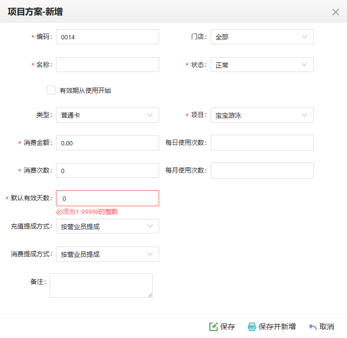 操作说明:点击【新增】输入编码、项目方案所属门店、选择项目、名称、类型、消费金额、消费次数、默认有效天数、状态,点击保存即可。