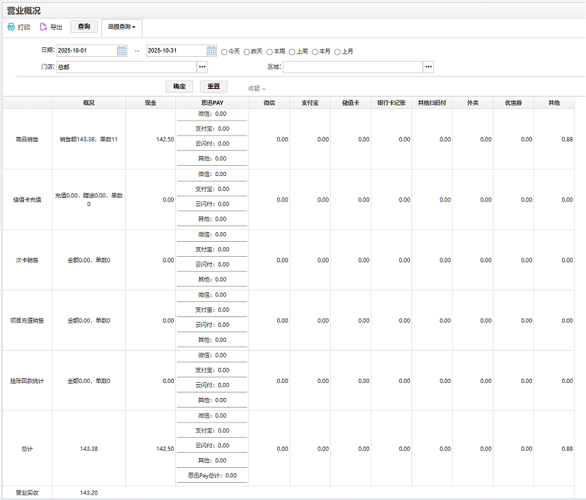 查询门店的整体营业状况,包括 商品销售、储值卡充值、次卡销售、项目充值销售、挂账回款统计、专项储值 ,以及 总计金额、营业实收金额 。