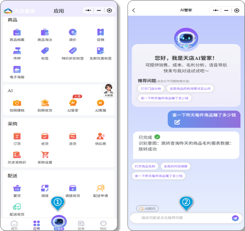 AI 管家功能界面,是辅助门店运营的智能工具。它主打销售、成本、毛利分析等经营数据服务,支持语音导航交互,还提供推荐问题快捷触发功能(如查询商品利润、门店分析等)。