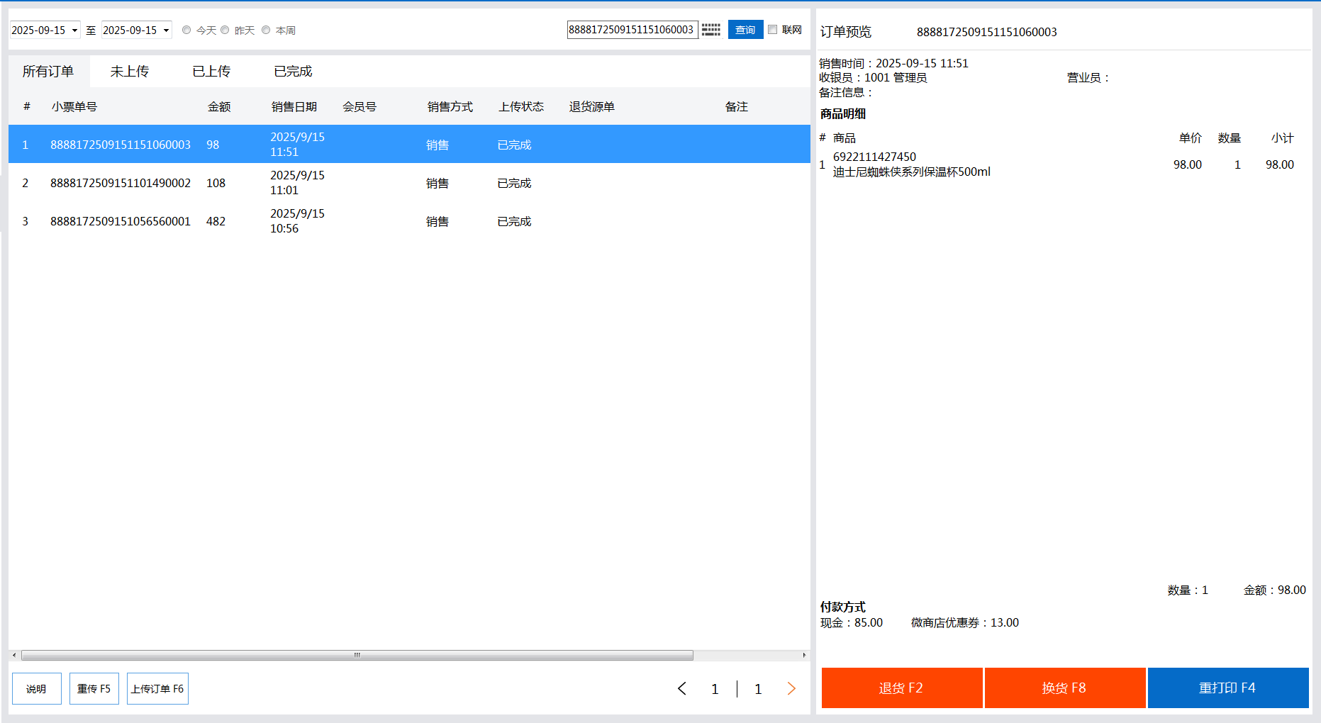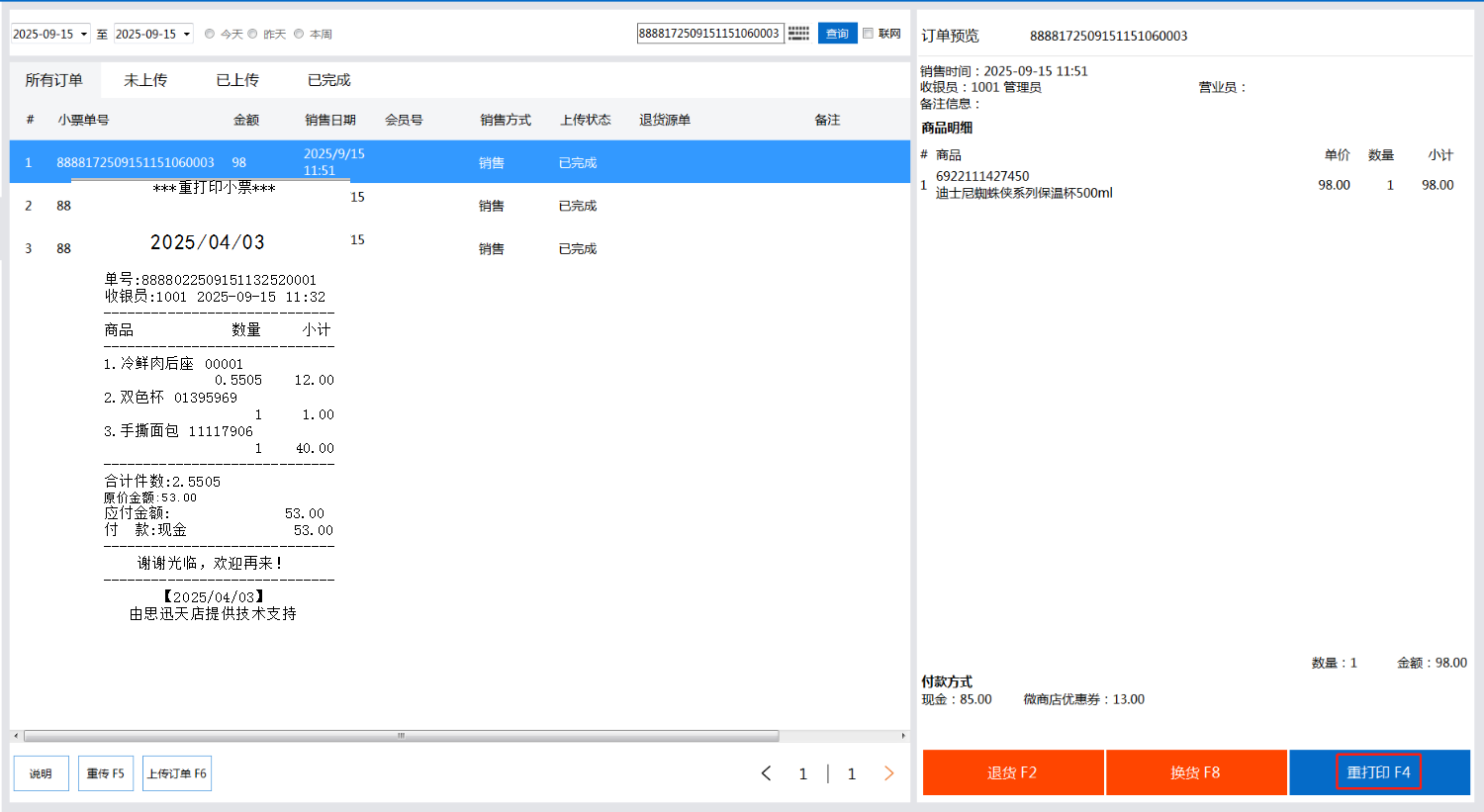 重打印F4:点击打印或按F4打印可重打印小票。如果需要携带会员信息,需要输入单号,勾选联网查询,再点击查询F1方可打印会员信息。
