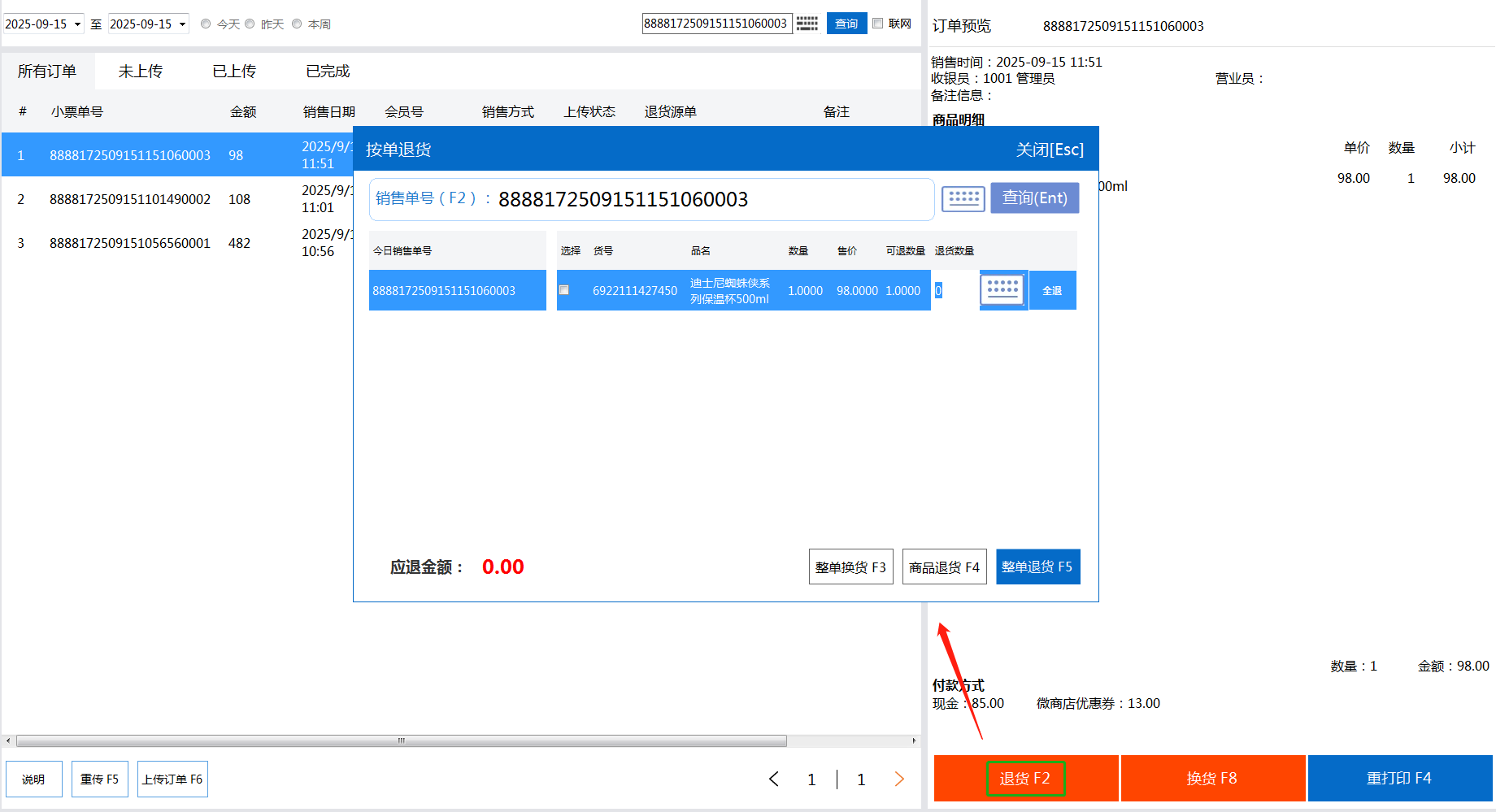 退货:交易单界面可直接按单退货,支持整单退货与部分单品退货。仅前台版本V1.48.199.101及以上支持,仅显示今日销售订单,昨日及之前前订单需输入货号查询,详情可见: 按单退货。