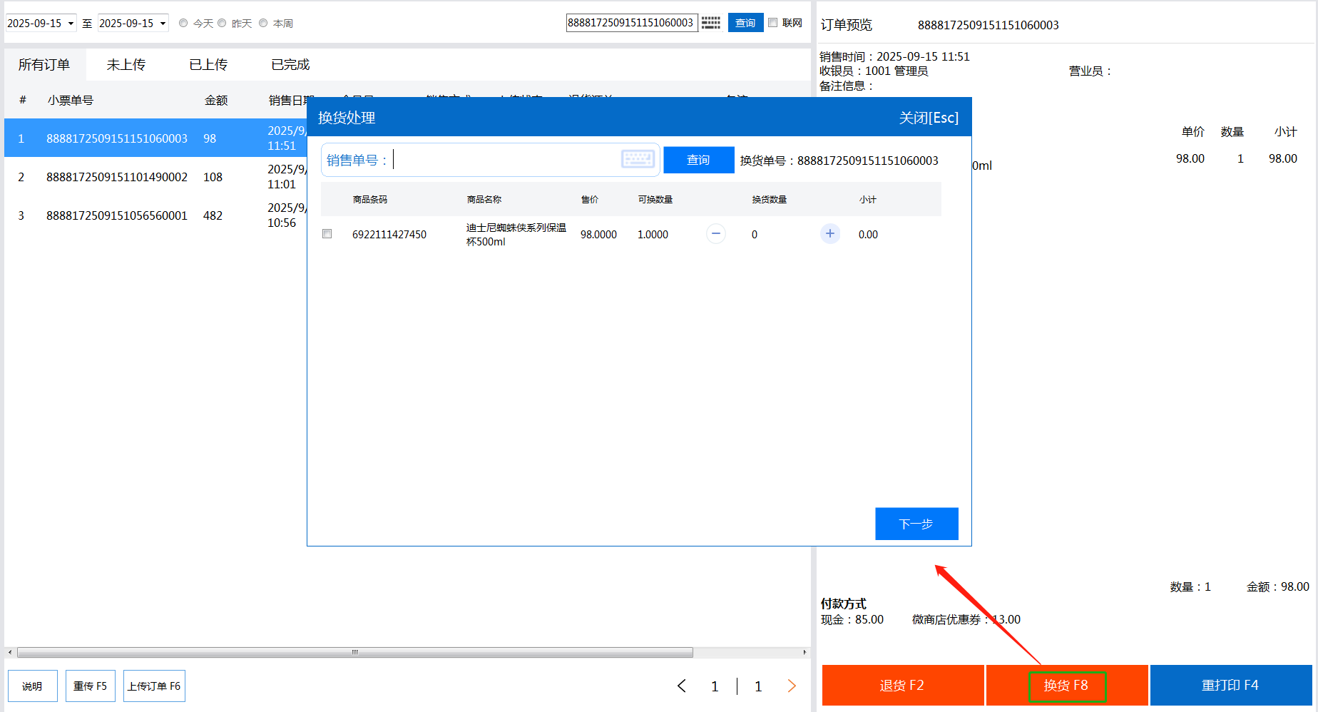 换货:点击换货可将顾客已购买的商品退还给超市,并更换为其他商品。仅前台版本V1.60.253.150及以上支持