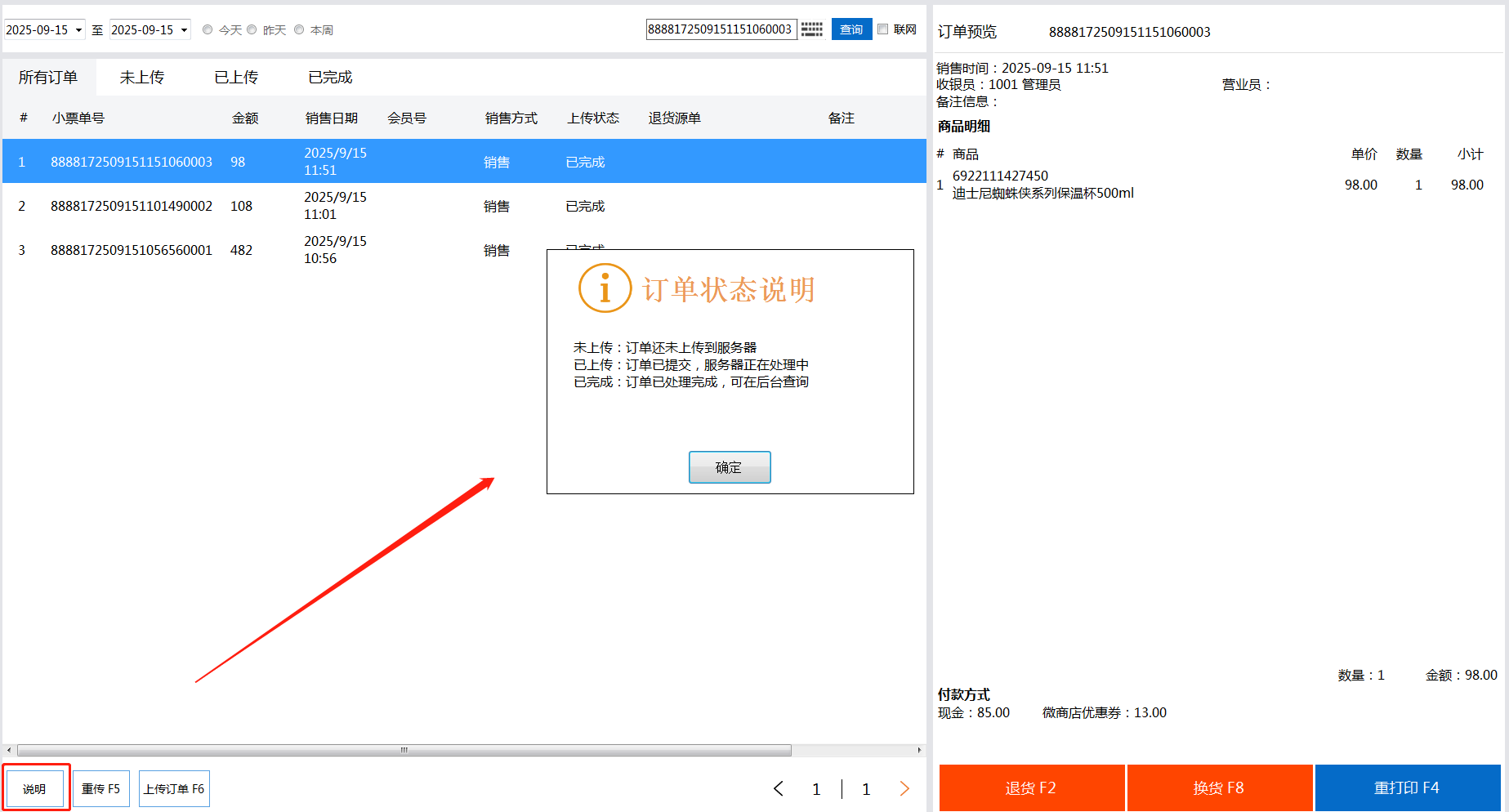 重传F5:如单据状态未上传,点击重传或按F5可重传当前选中的单据。