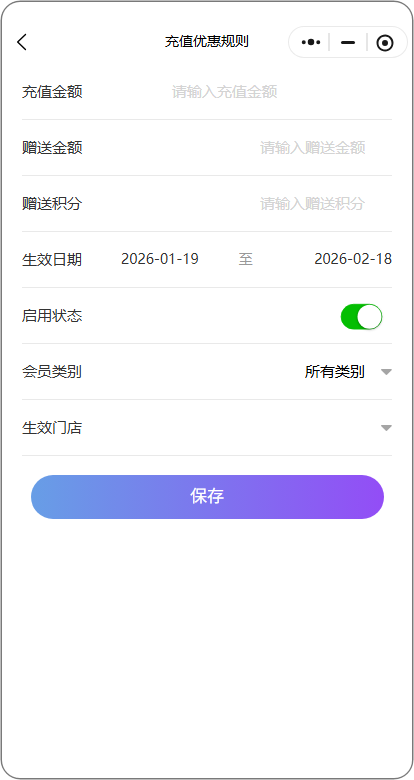 作用:便捷地定制充值赠送策略,包括赠送实际金额、积分奖励、代金券或专属礼包,以增加顾客满意度和激励消费