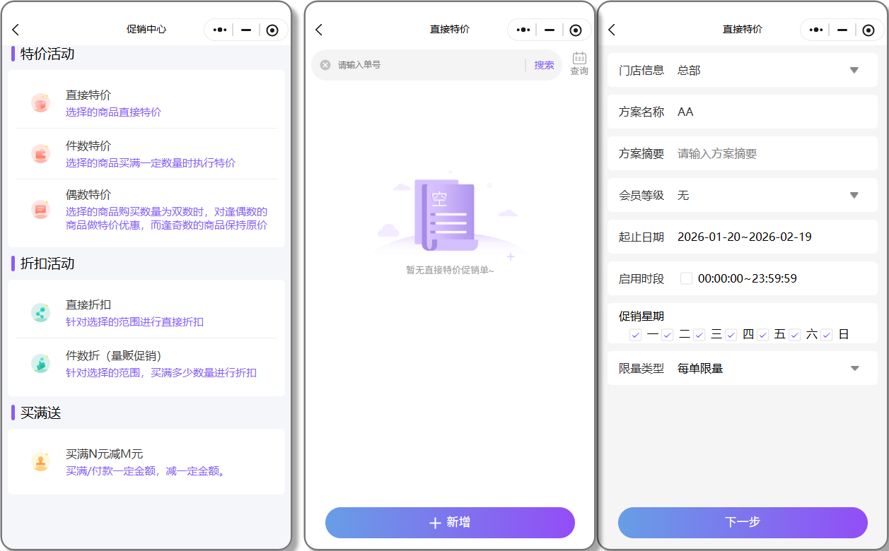 支持按照设置的范围限制单品直接特价的促销方案,默认显示后台建立的促销计划,可以看到参与促销的商品,支持按时间,门店查询对应促销;