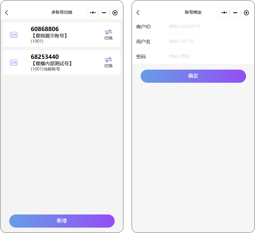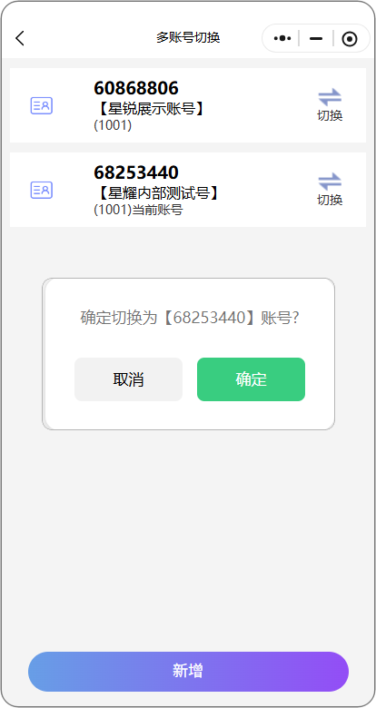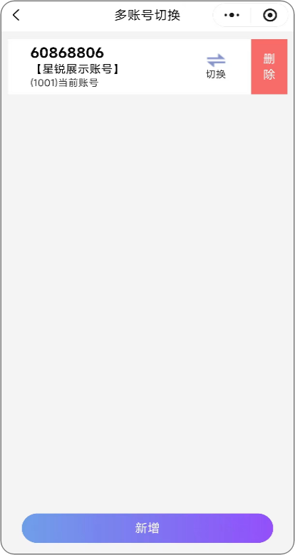 主要用于门店运营者管理多个关联账号,支持新增、切换、删除账号,适用于多门店 / 多角色的账号管理场景。