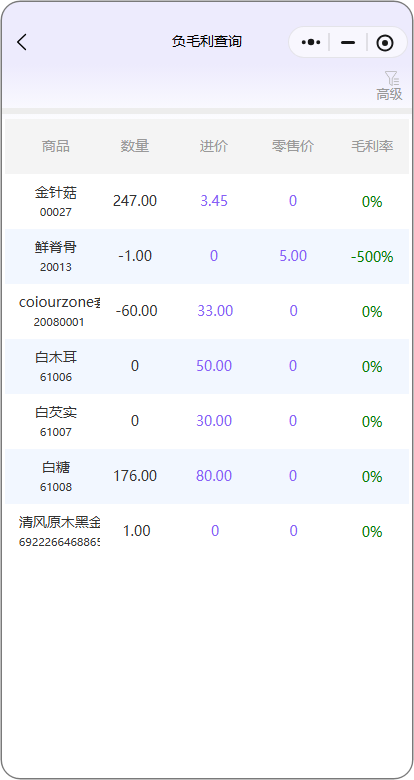 可以通过筛选条件查询负毛利商品数据,支持的筛选条件有:门店、类别、品牌、主供应商和商品;其中商品支持按货号/品名查询,也可以点击扫描键直接扫描商品条码