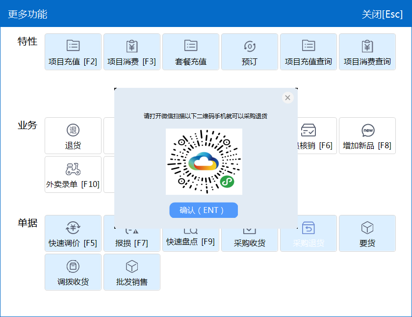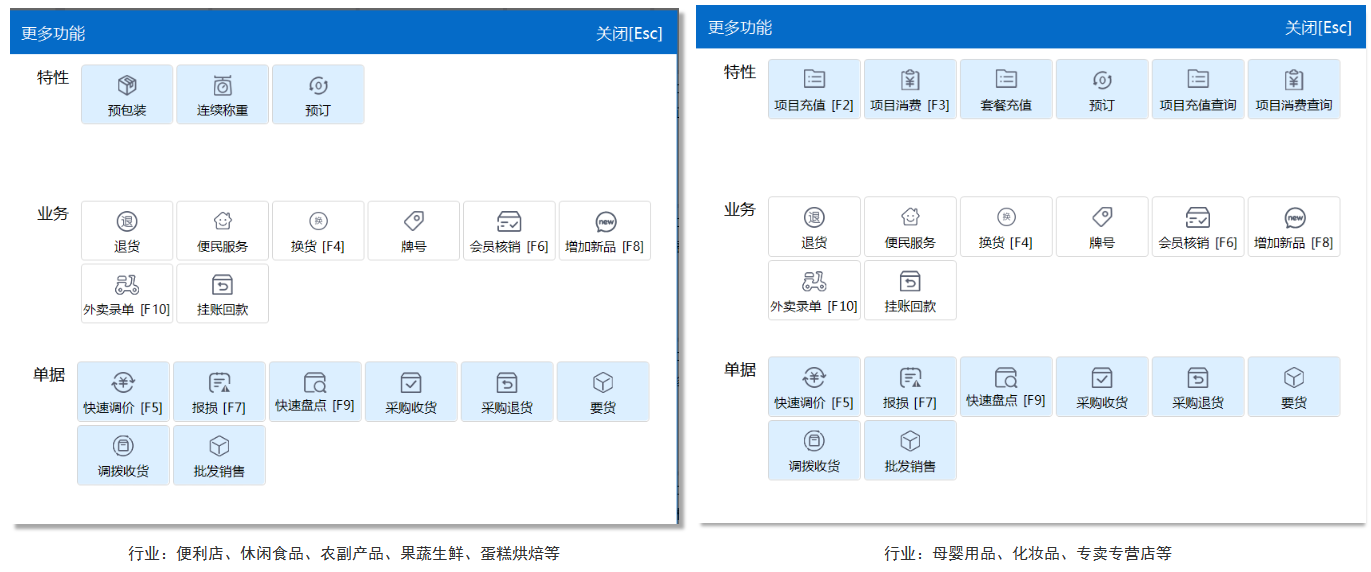 不同星耀行业商户前台更多功能有不一样的特性功能,如行业为便利店、休闲食品、农副产品、果蔬生鲜、蛋糕烘焙等,特性功能有预包装、连续称重、预订;如行业为母婴用品、化妆品、专卖专营店等,特性功能有项目充值、项目消费、套餐充值、预订、项目充值查询、项目消费查询。