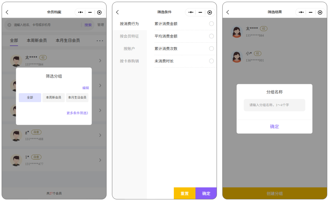 图标进往前筛选分组,点击更多条件筛选,按条件筛选出会员点击新建分组,输入分组名称即可新建分组。
