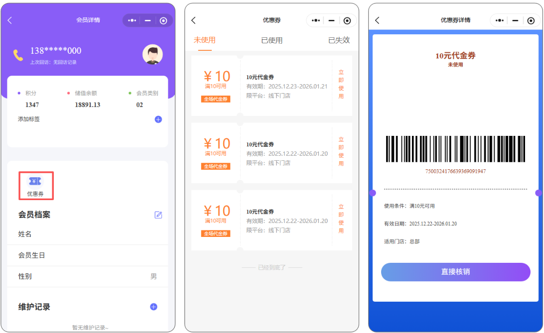 点击优惠惠券进入相应优惠券详情,点击直接核销可对优惠券核销。