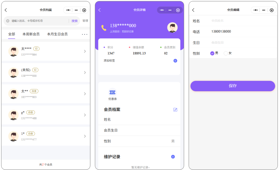 位置: 天店管家小程序 -> 应用->会员->会员档案