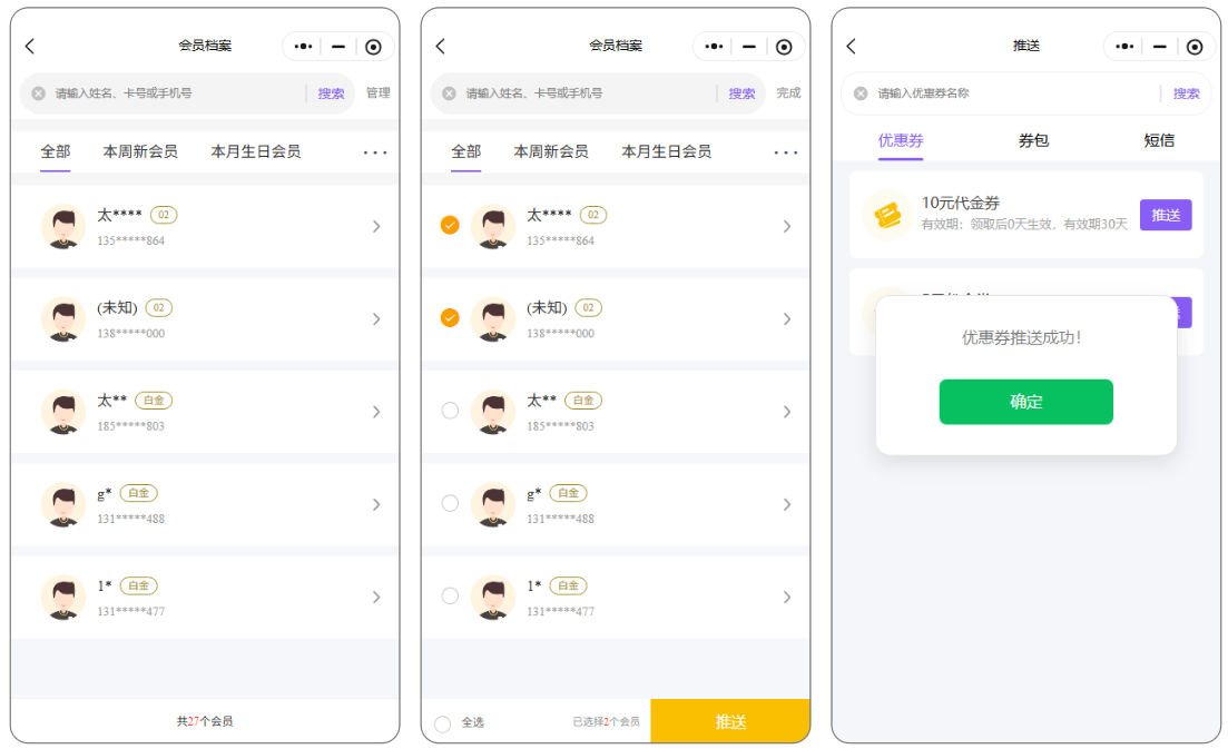 点管理可多选会员,选好会员后点推送,可对选择会员推送优惠券、券包、短信。