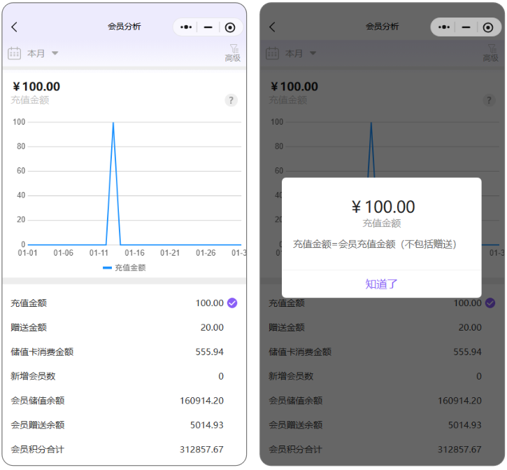 作用:查看会员的各项指标分析情况,包括:充值金额、赠送金额、储值卡消费金额、新增会员数、会员储值余额。