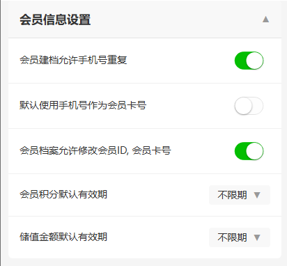 - 使用手机号当会员卡号:仅需输入手机号,系统自动关联会员卡号,无需单独填写; 前台 设置中未单独开启参数,默认手机号即会员卡号,后台新增会员无关联。