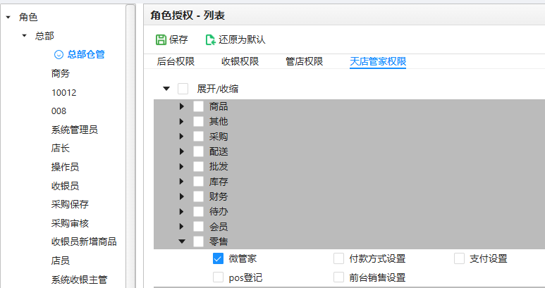 微管家 · 微小店会员版 开启后台-角色授权-天店管家:微管家权限