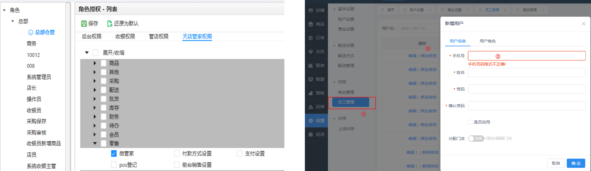 微管家 · 微商店3.0版本开启后台-角色授权-天店管家:微管家权限 并且 在天店后台-微商店-设置-员工管理 中 新增用户并且设置角色绑定微信使用