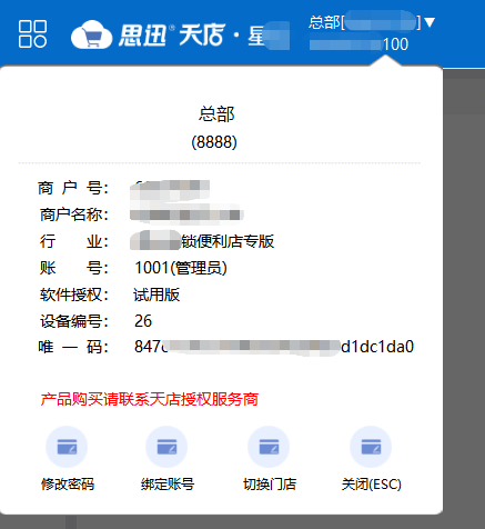 支持查看当前商户ID、商户名称、行业、账号、软件授权、设备编号、唯一码等信息,支持修改密码、切换门店等功能