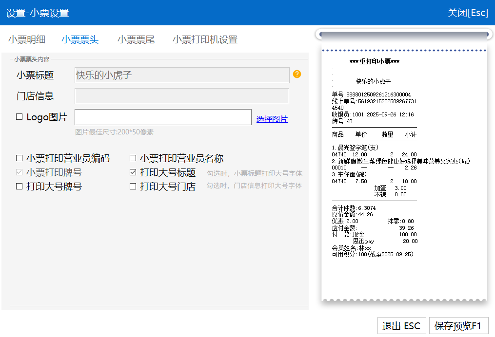 小票标题(提示信息:请于后台“零售管理”->销售设置->“自定义小票设置”中设置小票标题)