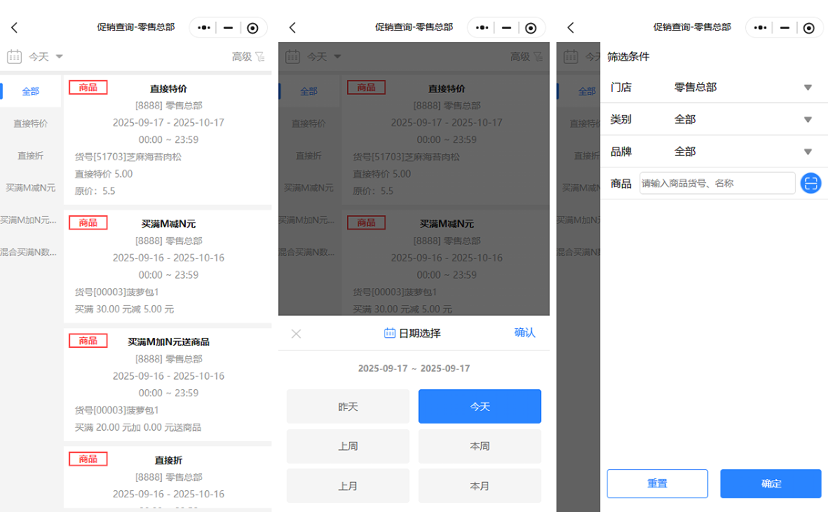 促销查询:用于查询当前时间端的有效促销方案;数据来源:天店后台的当前促销查询报表; 日期与门店点击左上角的时间可以设置查询不同时间端内的促销方案;点击右上角的高级,可以设置门店/类别/品牌查询条件,查询不同门店/类别/品牌的促销方案,也可以按商品查询。 如图所示 文档更新时间: 2025-09-17 08:41 作者:lixq